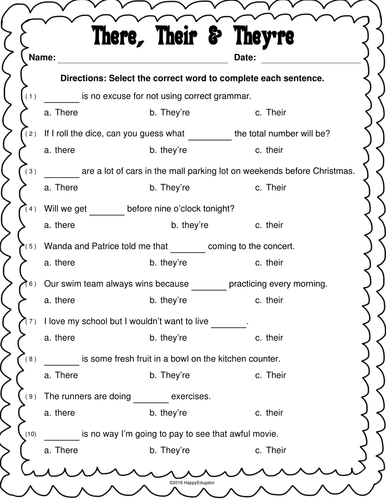 Their, there, they're worksheets Worksheets from www.worksheetplace.com There are five coins in the bag. All the players did their best. Grade 3 vocabulary worksheets on understanding the difference between there, they're and their. It follows common core standards for lanaguage for 2nd and 4th grade. For each sentence, write their, they're, or there in the blank line. Or worse, it can make a sentence completely meaningless due to not following english grammar rules. Send your suggestions or comments. These year 1 to year 6 grammar worksheets in pdf can also be used as great sats practise for uks2 students.